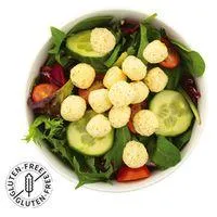 Ingredients: Soy protein concentrate, sunflower oil, tapioca starch, whey and buttermilk powder, spices and herbs (garlic, onion, parsley, jalapeno), salt, poppy seeds, melted cheese powder (cheddar, blue, soft ripened cheese and gouda, sodium phosphate), lactose, nonfat dry milk, tomato, natural flavors, malic acid, citric acid, sodium diacetate, rosemary extract.